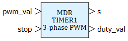 На выход блока duty_val выдаётся значение скважности по трем фазам в виде значения, записываемого в регистр сравнения таймера, выход используется для моделирования и может использоваться программой.