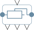 - Порт "R" формирует одномерное перемещение звеньев многозвенного механизма относительно друг друга: с этого порта считывается значение усилия (обобщенной силы) в кинематической паре и на этот порт подаются перемещение, линейные скорость и ускорение звена "2" относительно звена "1".