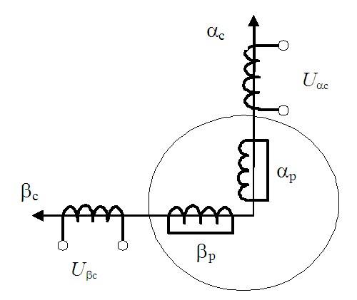 Как двухфазные, так и трехфазные ДА принято описывать системой дифференциальных уравнений в неподвижной системе координат αc, βc. При этом трехфазные машины приводят к двухфазным. Расчетная схема ДА представлена на рисунках (Рис. 1 и Рис. 2):