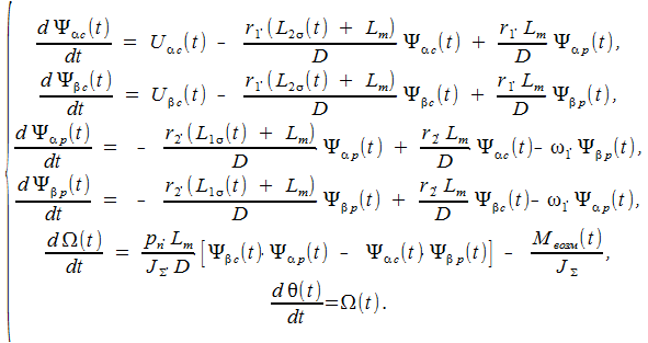 Уравнения (12) можно рассматривать как уравнения состояния ДА. В качестве переменных состояния здесь выступают проекции потокосцеплений на ортогональные оси, угловая скорость вращения ротора и угол поворота ротора. Внешними воздействиями на двигатель являются напряжения статора (образующие вектор управления) и момент сил сопротивления.