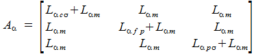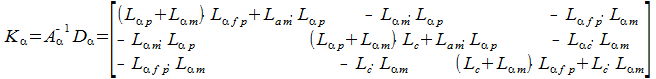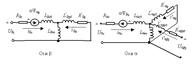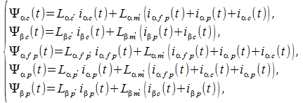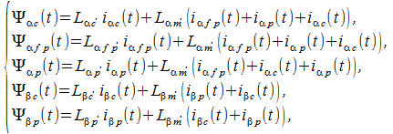 (3), где Lαc, Lβc, Lαfp, Lαp, Lβp – собственные индуктивности контуров статора и ротора, Lαm, Lβm – взаимные индуктивности между обмотками, лежащими по продольной или по поперечной осям. (В этой системе уравнений в приведенных к статору значениях параметров ротора символы ' (прим) опущены).