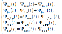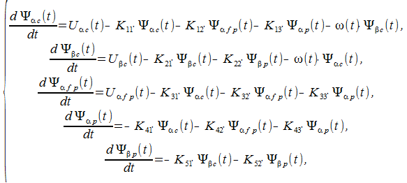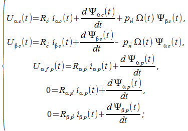 Ψαc(t), Ψβc(t), Ψαfp(t), Ψαp(t), Ψβp(t) – потокосцепления обмоток статора и ротора; Ω(t) – частота вращения ротора, pn – число пар полюсов; pf – число фаз питающего напряжения; ω = pnΩ(t) – частота вращения магнитного поля, Tв(t) – электромагнитный момент.