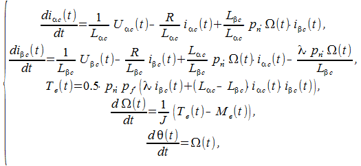 Согласно уравнениям (15), переменными состояния ДС являются токи статора iαc(t), iβc(t), угловая скорость вращения ротора Ω(t) и угол поворота ротора θ(t). Входными параметрами являются напряжения на обмотках статора и возмущающий момент.