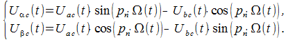 2) Напряжения на обмотках статора Uαc(t) и Uβc(t) являются напряжениями во вращающейся системе координат. Для получения их значений из входных напряжений Uac(t) и Ubc(t) используются соотношения: