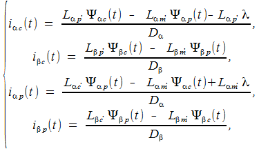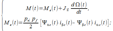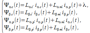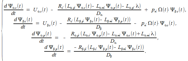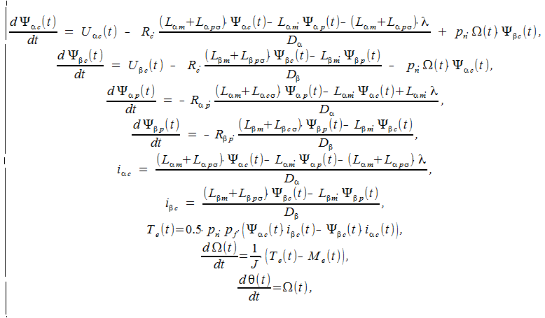 Согласно уравнениям (7), переменными состояния ДСС являются потокосцепления Ψαc(t), Ψβc(t), Ψαp(t), Ψβp(t), угловая скорость вращения ротора Ω(t) и угол поворота ротора θ(t). Входными параметрами являются напряжения на обмотках статора и возмущающий момент.