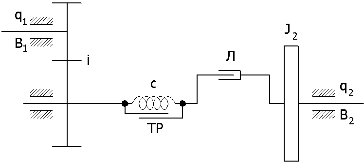c – коэффициент жёсткости безынерционного упругого элемента, ТР – элемент, характеризующий наличие внутренних сил вязкого трения в упругом элементе, Л – безынерционный элемент, характеризующий люфт в зацеплении, J2 – момент инерции на выходном валу звена, который может включать в себя момент инерции шестерни, момент инерции соединительной муфты и момент инерции объекта.