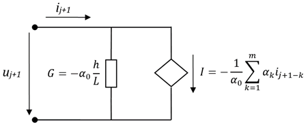 Рис. 1. Дискретная токовая модель индуктивности для метода BDFu, i – мгновенные значения напряжения и тока; j – индекс