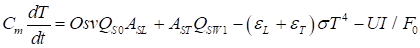 где: Osv - освещенность; Cm – удельная теплоёмкость ФП; Qs0 – плотность солнечного потока в условиях АМ0; QSW1 – плотность теплового потока от Земли; ASL, ASТ – поглощающая способность лицевой и тыльной стороны ФП; εL, εT – степень черноты лицевой и тыльной стороны ФП; σ – постоянная Больцмана; U, I – напряжение и ток БС.