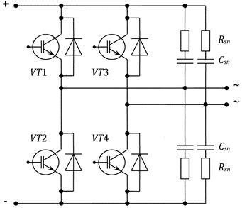 Схема однофазного мостового инвертора на IGBT транзисторах с демпфирующими RC-цепочками и противовключенными диодами, приведена на рисунке 1. Схема базируется на модели: ЭЦД - Диод и ЭЦД - Транзистор IGBT.