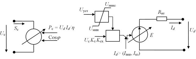 Модель выпрямителя построена на основе его внешних характеристик. Модель обеспечивает