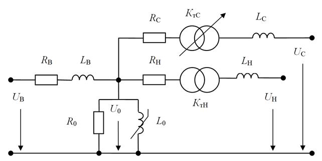 Эффект намагничивания трансформатора моделируется приближенно в соответствии с РД 153-34.3-35.125-99 "Руководство по защите электрических сетей 6-1150 кВ от грозовых и внутренних перенапряжений". Установка активных сопротивление обмоток низкого напряжения со стороны высокого напряжения обусловлена спецификой модели идеального трансформатора и использована для сокращения числа узлов модели. В свойствах модели потери короткого замыкания для сочетаний обмоток ВН-НН и СН-НН должны быть приведены к номинальной мощности обмотки низшего напряжения. Предполагается, что РПН установлено в линии среднего напряжения автотрансформатора.