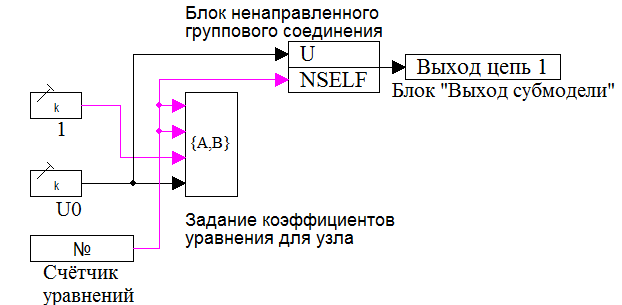 Константа, обозначенная как 1 на схеме, задаёт при помощи блока Коэффициенты линейного уравнения коэффициент равный 1 в системе уравнений с номером столбца равным номеру строки, который формируется на выходе блока Номер линейного уравнения. Правая часть уравнения формируется при помощи константы U0. При помощи блока формирования ненаправленного соединения данный блок формирует на своём выходе значение потенциала (соединение с именем U) и номер переменной потенциала данного узла в векторе решений системы линейных уравнений (соединение с именем NSELF).