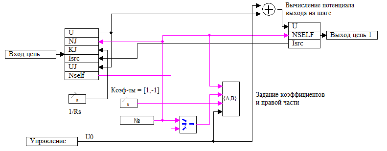 Константа задаёт при помощи блока "Задание коэффициентов уравнений для узла" 2 коэффициенты равные 1 и -1 в системе уравнений с номерами столбцов равными номеру строки, который формируется на выходе блока "Счётчик уравнений" и номеру предыдущего узла. Правая часть уравнения формируется со входа "Управление". При помощи блока формирования ненаправленного соединения данный блок формирует на своём выходе значение потенциала (соединение с именем U) и номер переменной потенциала данного узла в векторе решений системы линейных уравнений (соединение с именем NSELF). При этом ток источника напрямую передаётся в предыдущий узел.