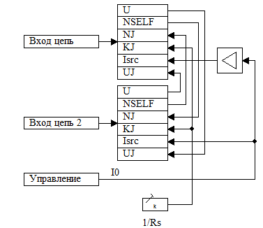 Данный блок при помощи блоков для создания ненаправленных соединений передаёт в подключенные к данному элементу внутренние узлы электрической схемы значения проводимостей (KJ), которые вычисляются как 1/Rs, и значения токов (Isrc), задаваемые с входа "Управление". При этом с первого входа значение своего номера узла (NSELF) передаётся как значение соседнего номера узла (NJ) и наоборот. Ток источник подаётся с положительным знаком на вход 2 и с отрицательным на вход 1.