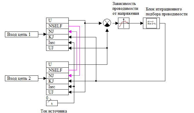 Данный блок при помощи блоков для создания ненаправленных соединений передаёт в подключенные к данному элементу внутренние узлы электрической схемы значения проводимостей (KJ), которые вычисляются как функция от разности входных потенциалов, и значения токов (Isrc), равные нулю. Для того чтобы обеспечить корректный подбор проводимости производится проверка сходимости проводимости путём сравнения значения проводимости на предварительном шаге и окончательном шаге. Значение своего номера узла (NSELF) передаётся как значение соседнего номера узла (NJ) и наоборот.
