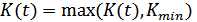 где T(t) - момент пружины, Н·м; K(t) – коэффициент жесткости, Н·м/рад; Kmin – минимально возможный коэффициент жесткости, Н·м/рад; φ(t) – угол между портами C и R, рад; ωC(t) – угловая скорость порта C, рад/с; ωR(t) - угловая скорость порта R, рад/с.