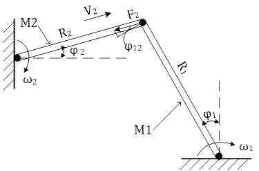 R2 - расстояние шарнира от оси вращения тела М2;