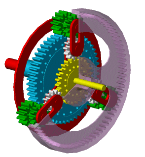 В блоке реализована модель планетарного механизма с двумя сателлитами. Схематически механизм