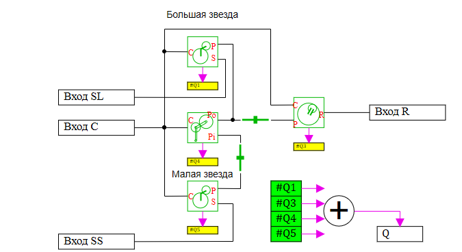 малая звездочка, SL – большая звездочка, R - обод). А также один математический порт, на