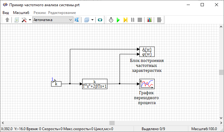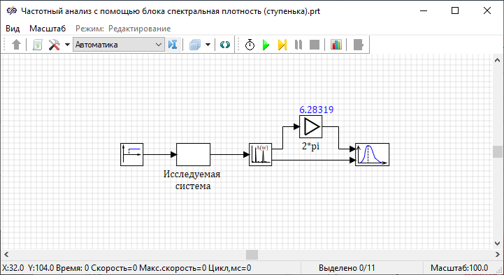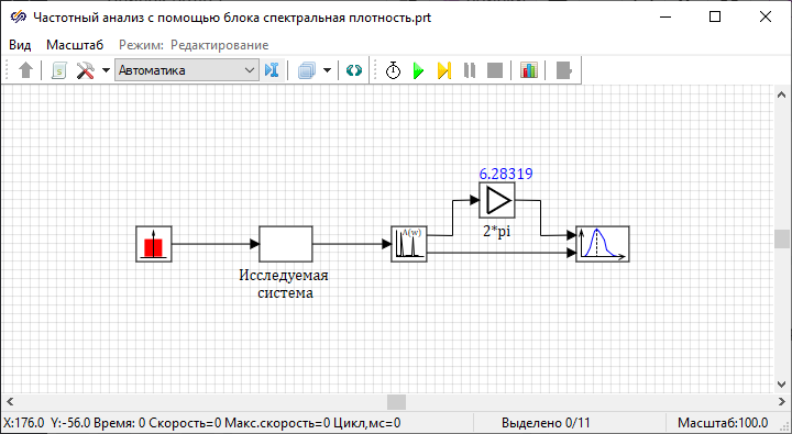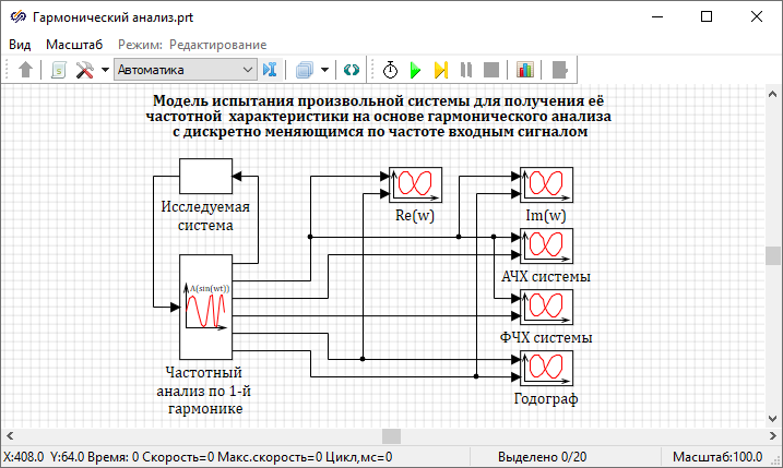 Пример использования данного блока представлен в проекте, расположенном в директории установки SimInTech: SimInTech\Demo\Графики и исследования\Частотный анализ\Гармонический анализ\Динамическая система\Анализ динамической системы.prt