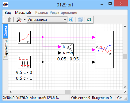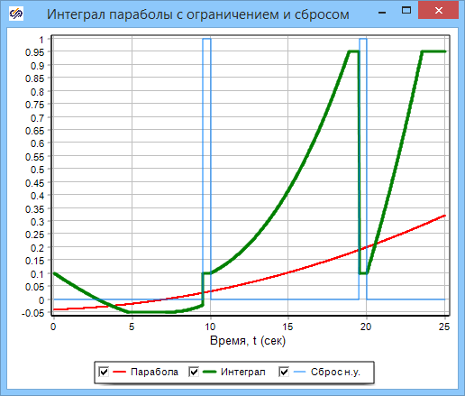Из итогового графика видно, что в моменты подачи на управляющий (второй порт) единичного сигнала происходит сброс значения интеграла к начальным условиям равным в примере 0,1. При нулевом управляющем сигнале интегратор ведёт себя как интегрирующее звено с наложенными ограничениями.