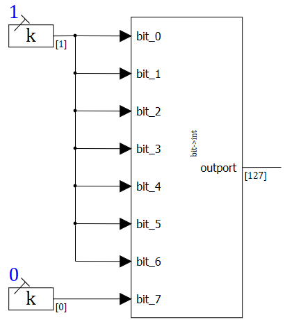 Количество входных скалярных или векторных портов задается в свойствах блока. Блок векторизован. Размерности всех входных портов должны совпадать. Выходной порт один со скалярным или векторным целочисленным сигналом. Размерность выходного сигнала совпадает с размерностью входных сигналов.