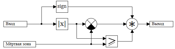 | dead zone | Величина "мертвой зоны". Если вход по абсолютной величине меньше зоны нечувствительности, то выход блока равен 0. | Математическая |