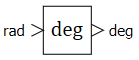 Блок реализует перевод угла из радиан в градусы по формуле deg = rad ⋅ 180°/π, где deg - величина угла в градусах, rad - величина угла в радианах.