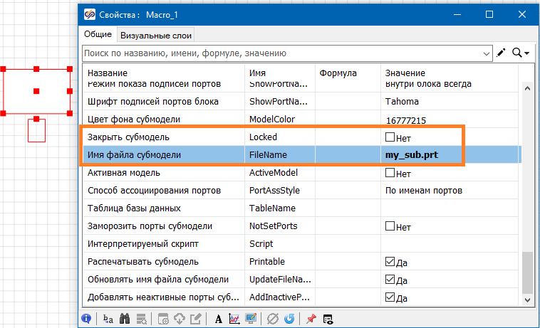 Общее свойство "Закрыть субмодель" задает поведение интерфейса при двойном щелчке по субмодели. Если это свойство задано "Нет", то при двойном щелчке левой кнопкой мыши по субмодели будет осуществляться переход внутрь субмодели. Если свойство задано "Да", то двойной щелчок мышью будет открывать окно свойств субмодели. В последнем варианте для перехода внутрь субмодели потребуется вызывать контекстное меню, в котором надо выбрать пункт Действия → Войти в субмодель.