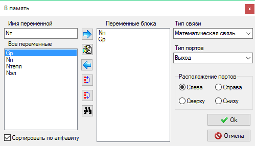 Блок предназначен для соединения одной части схемы с другой, находящейся в произвольном месте проекта. Установка блока на линию связи соответствует установке именованной метки на блок-схеме. После чего, помеченный сигнал может быть использован в произвольном месте проекта с помощью блока Из памяти. Блок векторизован и выполняет процедуру формирования в динамической памяти глобальных (именованных) переменных, посредством которых реализуется 1-ый этап "беспроводной" передачи данных (например, из Главного схемного окна в субмодель или из субмодели в Главное схемное окно или в другую субмодель). Блок имеет только входные порты (один или несколько).