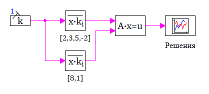 где A – матрица коэффициентов; x(t) – вектор решений; u(t) – вектор правых частей. Блок имеет два векторизованных входных порта: 1-ый входной порт – для ввода матрицы, представляемой в виде вектора коэффициентов при распаковке матрицы по строкам. 2-ой входной порт – для ввода вектора(вектора правых частей). Блок имеет один векторный выходной порт, предназначенный для вывода вектора(вектора решений). Размерность векторного сигнала на 1-ом входном порте должна быть равна, где– количество уравнений в системе, а размерности сигналов на 2-ом входном порте и на выходном порте – одинаковы и равны.