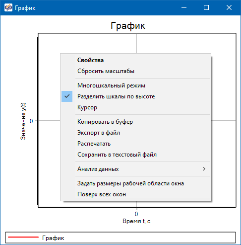 При нажатии правой кнопкой мыши на графическом окне, появится выпадающее меню с пунктом меню Свойства, а также
