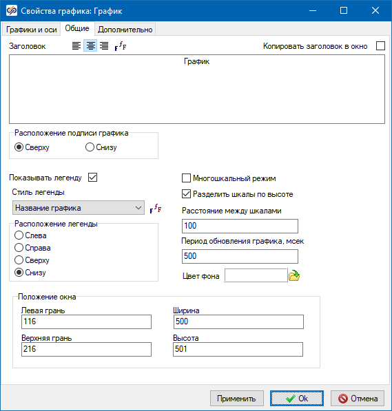 - Заголовок - наименование графика (вверху и в заголовке окна), можно задать параметры шрифта;