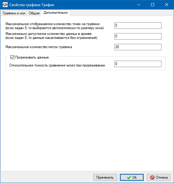- Прореживать данные - если включено (по умолчанию да), то отображаемые данные подвергаются прореживанию по следующему алгоритму: если 3 последовательные расчетные точки лежат на одной прямой (с заданной точностью), то средняя точка не фиксируется и не отображается на графике, так как отрезок, проведенный через 1-ю и 3-ю точки, содержит и 2-ю точку. Если необходимо иметь информацию обо всех расчетных данных, выводимых на график, то необходимо снять (выключить) эту опцию.
