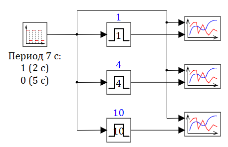 в блоки будем подавать один и тот же сигнал типа "меандр" с полным периодом 7 секунд