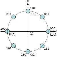 Блок предназначен для демодулирования вектора символов M-PSK модуляции (фазовая модуляция, англ. phase-shift keying). Порядок модуляции М задается пользователем. Применяемое сигнально-кодовое созвездие для 8-PSK модуляции представлено на рисунке.
