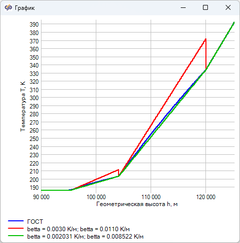 Значения градиента термодинамической температуры β для высот 102450 м и 117777 м не указаны в ГОСТ. Были приняты следующие значения градиентов термодинамических температур: