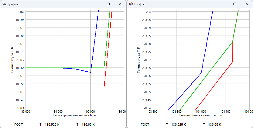 Кинетическая температура для геопотенциальной высоты H = 94000 м имеет значение T = 186.525 K и используется в расчетах для температур от 94000 м до 102450 м. Эти расчеты расходятся с табличными значениями ГОСТ, в связи с чем было принято значение температуры T = 186.65 K.