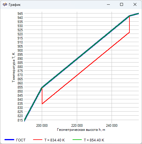Температура для геометрической высоты h = 200000 м имеет значение T = 834.40 K и используется в расчетах для температур от 200000 м до 250000 м. Эти расчеты расходятся с табличными значениями ГОСТ, в связи с чем было принято значение температуры T = 854.40 K.