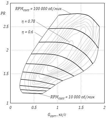 - Матрица КПД размерностью NRPM×NPR. Элементы матрицы задают КПД компрессора при частоте вращения вала турбокомпрессора (изотахе), соответствующей номеру строки, и степени повышения давления с соответствующими номерами строки и столбца.