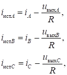 где iA, iB, iC – фазные токи, соответствующие заданным значениям; uвыхА, uвыхB, uвыхС – фазные напряжения источника тока, определяемые при расчете; R –сопротивления источника тока (при значении свойства блока "Вид цепи сопротивления источника" равному "R").