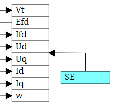 Порт «SE» модели СД предназначен для подключения блока системы возбуждения. Входным сигналом от системы возбуждения является сигнал напряжения возбуждения EFD. Выходными сигналами СД для системы возбуждения являются: напряжение статора Vt, ток возбуждения IFD, напряжения в dq координатах Vd и Vq, ток статора в dq координатах Id и Iq, угловая скорость ротора 𝜔 в о.е.