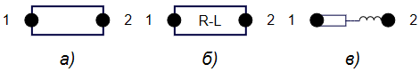 В блоке предусмотрена возможность изменения графического представления RLC-цепи, присвоением свойству «Показывать вид цепи» значений: «нет», «текст», «мнемосхема». На рисунке представлены варианты графического отображения блока при значении «R-L» свойства «Вид цепи». При выборе значений «R», «L» и «C» свойства «Вид цепи» независимо от значения свойства «Показывать вид цепи» графическое изображение блока представляется в виде мнемосхемы.