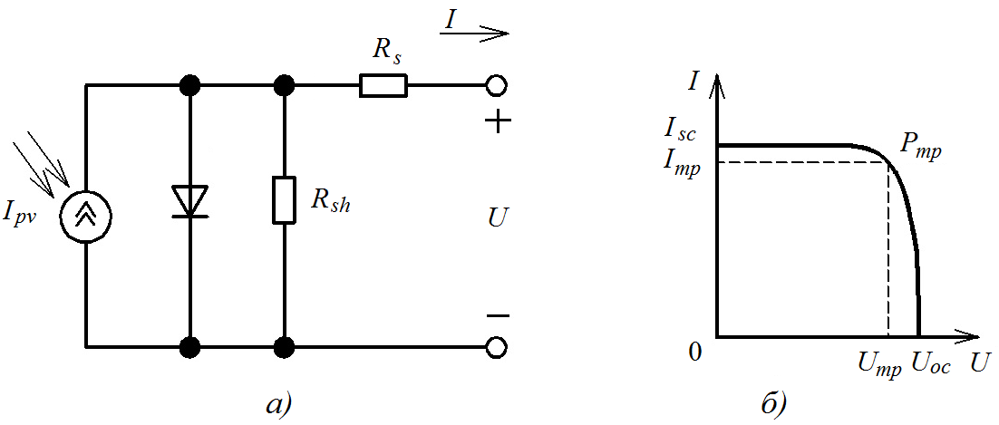 Рисунок 1 – Схема замещения а) и ВАХ солнечного элемента б):