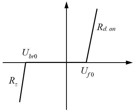 Для кусочно-линейной ВАХ задаются динамические сопротивления обратного участка ВАХ Rz и прямого Rd. on в виде вектора: [Rz, Rd. on]. И начальные напряжения обратного участка Ubr0 (отрицательное значение) и прямого Uf0 в виде вектора [Ubr0, Uf0]. Вид кусочно-линейной ВАХ показан на рисунке 1.