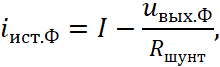 где I – ток, соответствующий заданному значению (из свойства или через порт Ire); uвых.Ф – напряжение на источнике, определяемое при расчете; Rшунт – сопротивление шунта источника тока (при значении свойства блока "Вид цепи сопротивления источника" равному "R").
