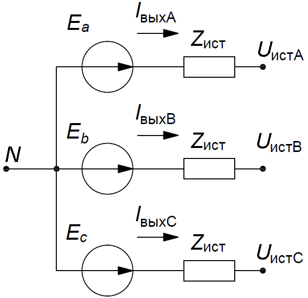 - IвыхA, IвыхB, IвыхC – токи фаз источника напряжения, определяемые при расчете;