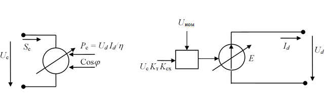Со стороны переменного тока выпрямитель является нагрузкой. При моделировании нагрузки принимается что она симметрична. Напряжение для определения мощностей принимается равным напряжению прямой последовательности. Расчет может производиться в комплексных числах, как основной, и в мгновенных значениях, в качестве дополнительной возможности.