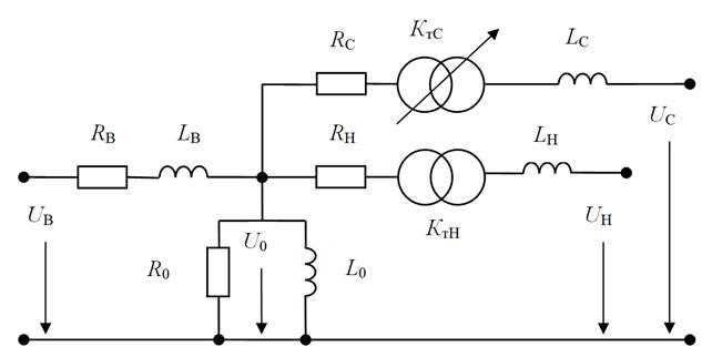 - R, L – активное сопротивление и индуктивность рассеяния соответствующей обмотки;