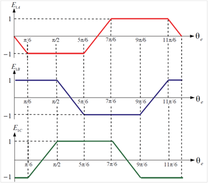 Трапецеидальная форма ЭДС фаз в зависимости от электрического угла ротора показана на рисунке